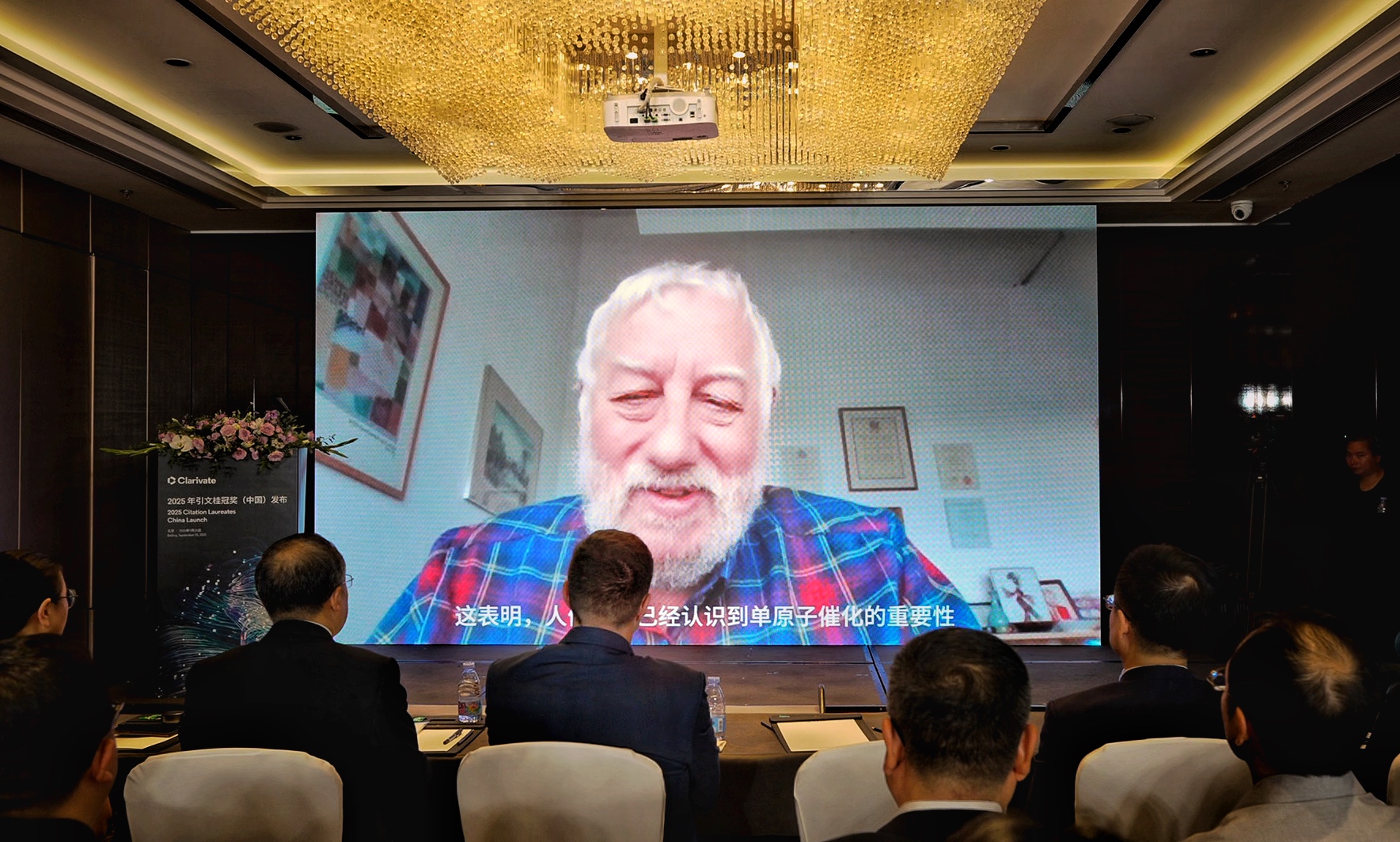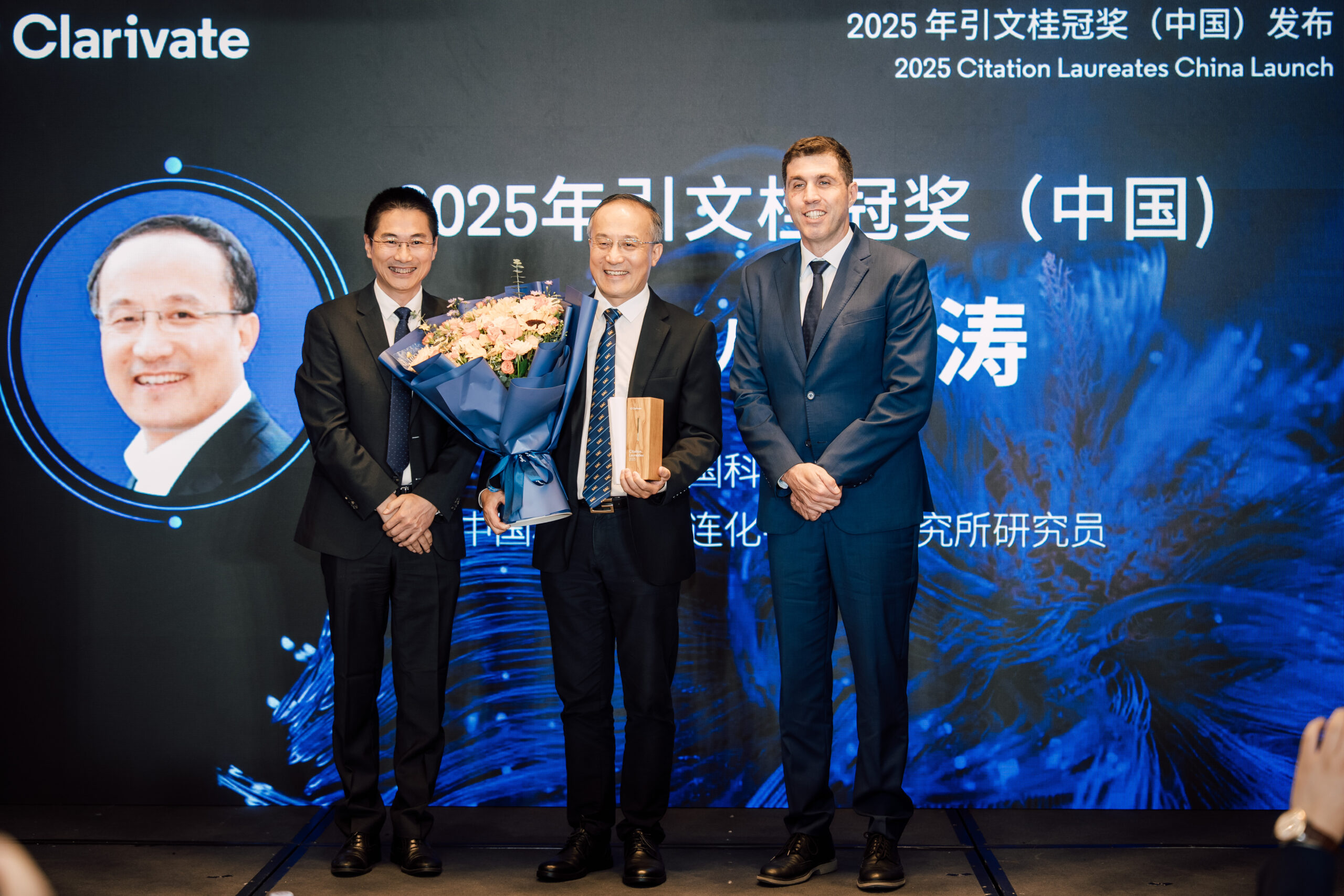 中国科学院院士、中国科学院大连化学物理研究所研究员张涛,因在单原子催化领域的开创性工作而获奖,成为首位来自中国内地的引文桂冠奖得主,彰显了中国在全球科学领域日益增长的影响力。科睿唯安全球副总裁 Osher Gilinsky 与王利先生为张涛院士颁发了奖杯和证书,并献上鲜花表示祝贺.